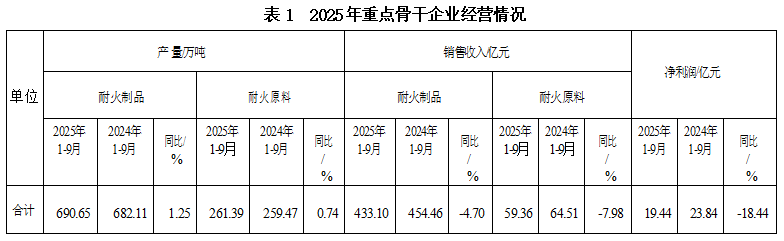 協(xié)會(huì)通過對(duì)113家重點(diǎn)耐火材料企業(yè)2025年1-9月經(jīng)營(yíng)情況調(diào)研顯示,耐火材料產(chǎn)量952.04萬噸(含部分耐火原料),同比增長(zhǎng)1.11%;113家企業(yè)耐火制品產(chǎn)量690.65 萬噸,同比增長(zhǎng)1.25 %。耐火材料銷售總收入492.46億元,同比降低5.11 %;剔除原料,其中耐火制品銷售總收入433.10億元,同比降低4.70%。113家企業(yè)實(shí)現(xiàn)利潤(rùn)19.44 億元,同比下降18.44%,銷售利潤(rùn)率約3.95%;上繳稅金25.50億元,同比下降4.00%。表1列出了上述調(diào)查情況。