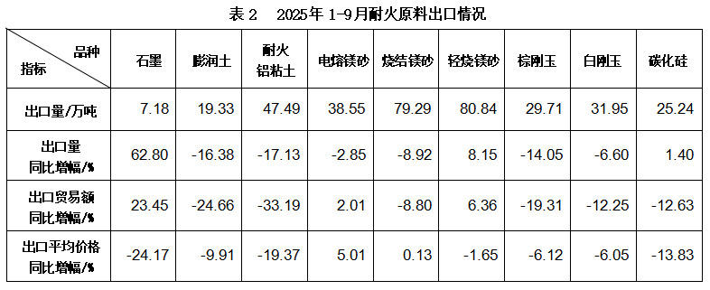 1-9月,全國(guó)耐火原材料進(jìn)出口貿(mào)易總額25.76億美元,比上年同期降低13.65%。其中出口貿(mào)易額24.28億美元,同比降低15.06%;進(jìn)口貿(mào)易額1.48 億美元,同比增長(zhǎng)18.57%;全國(guó)耐火原材料出口總量495.86萬噸,同比降低 8.21%。其中耐火原料出口量359.59萬噸,同比降低5.37%;耐火制品出口量136.27萬噸,同比降低14.95%。相較2024年同期,原料和制品的出口量和出口平均價(jià)格都有不同程度的降低。