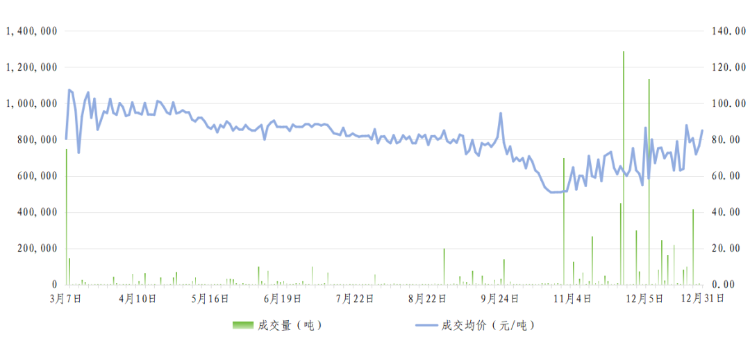 2025年,納入碳排放權(quán)交易市場(chǎng)配額管理的重點(diǎn)排放單位共計(jì)3378家,其中發(fā)電行業(yè)重點(diǎn)排放單位2087家,鋼鐵行業(yè)重點(diǎn)排放單位232家,水泥行業(yè)重點(diǎn)排放單位962家,鋁冶煉行業(yè)重點(diǎn)排放單位97家,市場(chǎng)共運(yùn)行243個(gè)交易日。截至2025年12月31日,全國(guó)碳排放權(quán)交易市場(chǎng)配額累計(jì)成交量8.65億噸,累計(jì)成交額576.63億元。其中,2025年全年配額成交量2.35億噸,同比增長(zhǎng)約24%,成交額146.30億元,交易規(guī)模持續(xù)擴(kuò)大。交易價(jià)格保持在合理區(qū)間,年底收盤(pán)價(jià)為74.63元/噸,全年交易均價(jià)為62.36元/噸。組織完成8場(chǎng)單向競(jìng)價(jià),滿足市場(chǎng)多樣化交易需求。