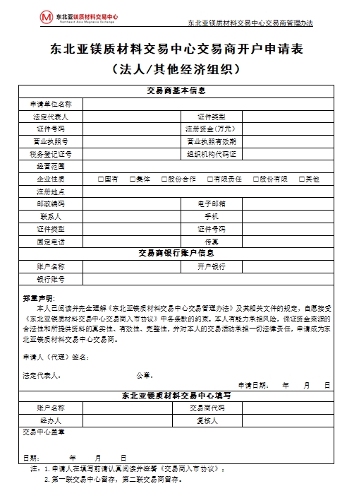 第五條 申請(qǐng)交易中心交易商,須填寫《交易商開戶申請(qǐng)表》,并按交易中心要求提供相關(guān)文件。